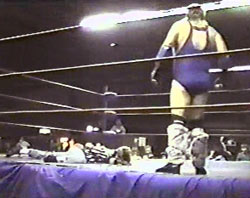My catch line was,"It's the most fun you can have with your pants on!" And about two hundred wrestling folks filed in that night. I think I knew about sixty people in the crowd and for most of them it was their first card ever . If it is your first night at wrestling, you have to really turn it on and the Front Row was primed to really raise the roof. And we did just that. The wrestlers that night were a bunch of locals trying to put on a good show. And they needed a lot of help because most of them really never should have been in the ring. Personally. I get really tired for seeing a bunch of guys trying to act like wrestlers that weigh about a buck seventy-five. It just doesn't work visually but I will say one thing about this motley crew, they did try. There were three moments that really did stand out that night. First, there was a match with Bam Bam Coleson verses Cowboy Chris Star. Coleson I knew from way back because he use to buy slurpees from me when I worked at Seven Eleven. And he weighed in at about three hundred and fifty five pounds and that is being very kind. The Cowboy looked like he spent time starving in India and all his synapses didnít fire if you get my drift. We spent the whole match yelling at Bam Bam to pull up his pants. Then Bam Bam went for the running shoulder block in the turnbuckle on to Chris Star. Chris was a lot smarter than we all thought because he moved out of the way.